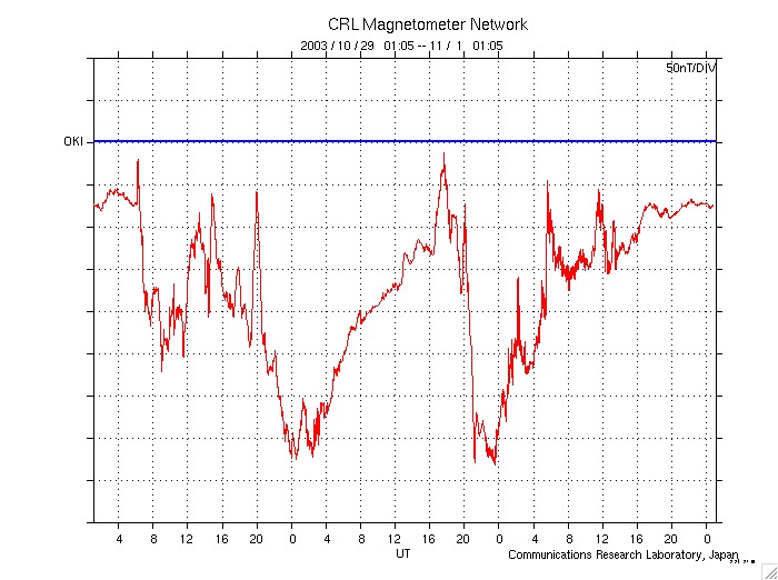 沖縄の磁場データより磁気嵐の進行状況を見ると、世界時31日0時(日本時間31日9時)以降順調に弱まって来ました。