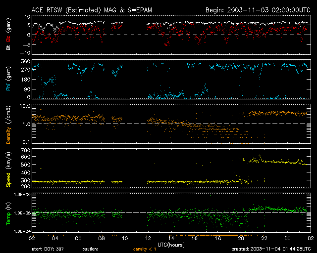 太陽風速度のデータの前半部に300km/秒となっている部分がありますが、太陽プロトンの影響のため正しい値ではありません。