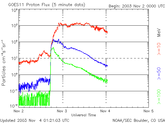 このため、太陽プロトンは一時1000PFU越えるレベルに上がりました。