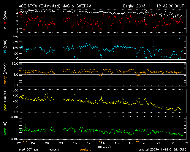 現在の磁気圏擾乱の状況ですが、太陽風の速度は順調に低下し現在は600km/秒レベルに下がっています。