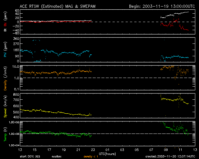 ACE衛星による太陽風データを見ると、太陽風速は約700km/秒とたいへん高速です。