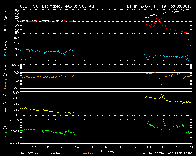 ACE衛星で観測された太陽風は、地球へ届くまでに30〜40分程度の時間がかかりますので、