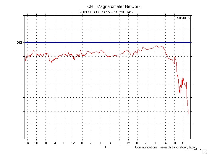 沖縄の磁場変動によると、磁気嵐の振幅は既に200nTを越え、更に発達を続けています。