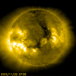 SOHO EIT284の写真をご覧下さい。中央やや右寄りに暗い部分があります。