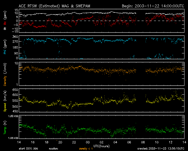 および、太陽風の密度(3番目の橙線)、速度(4番目の黄線)