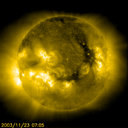 SOHO衛星EIT284の写真の中央から右寄りにコロナホール(暗い部分)が見られます。