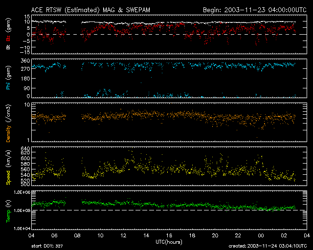 ACE衛星の太陽風データによると、磁場の強度は依然10nTレベルを保っています。