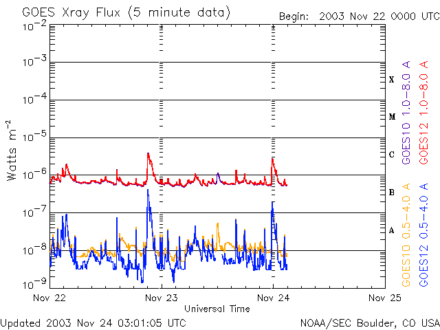 GOES衛星のX線データによると、この2日間は大きなフレア(太陽爆発)は発生していません。