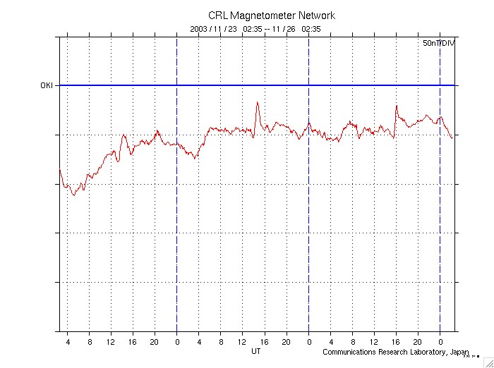 沖縄の磁場データを見ると、世界時25日16時(日本時26日1時)に急峻な増加が見られます。