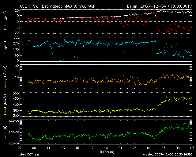 ACEの太陽風データによると、磁場強度(白線)は20nTに達し、