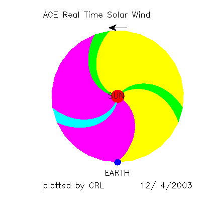 太陽は反時計回りに自転していますので、太陽風の構造(色のついた円)も反時計方向に回転します。