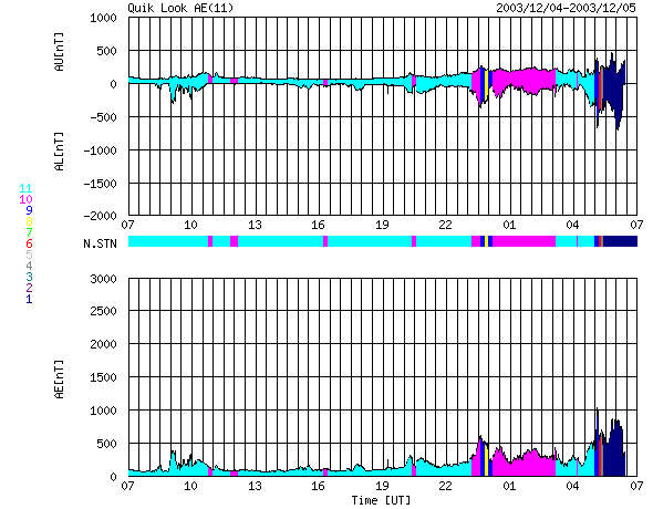 下段のAEグラフの値が高くなると、オーロラ活動が活発化しています。