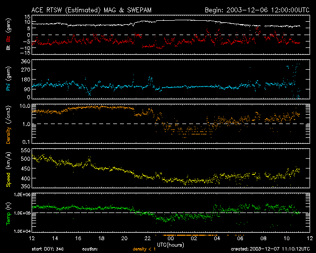 および、太陽風の密度(3番目の橙線)、速度(4番目の黄線)