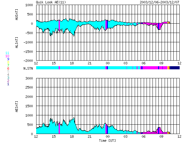 下段のAEグラフの値が高くなると、オーロラ活動が活発化しています。