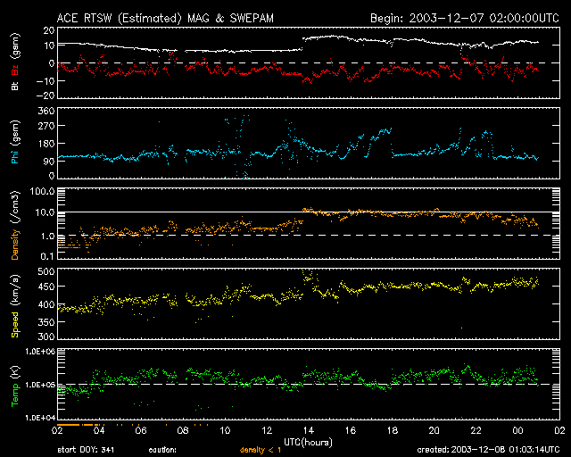 太陽風の磁場強度が10〜15nTの強さになっているため、南向きの成分も-5〜-10nTに達する事が多く、