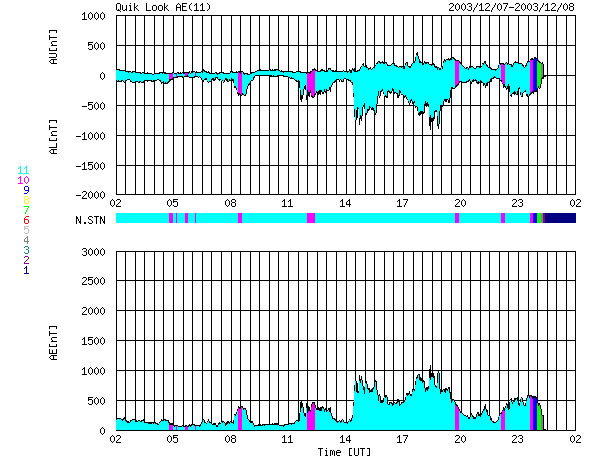下段のAEグラフの値が高くなると、オーロラ活動が活発化しています。