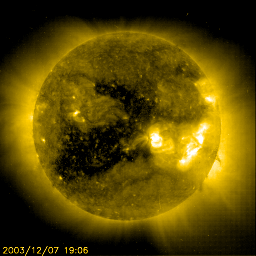 SOHO EIT284の太陽画像によると、コロナホール(やや暗い部分)が太陽の中心を越えて西側(右側)に伸びています。