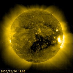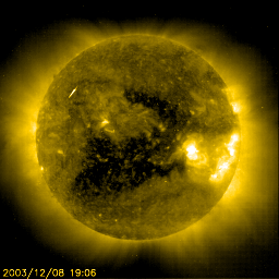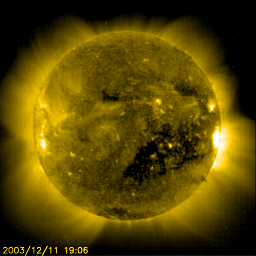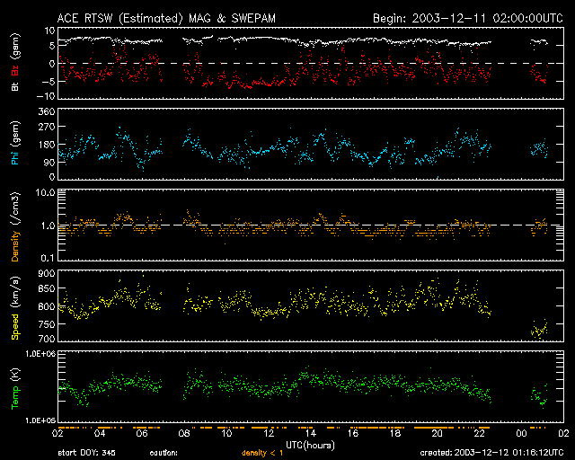 2003/12/12 10:18 更新 高速太陽風は現在も続いていますが、磁気圏の乱れは激しいものではありません。 担当 篠原 コロナホールによる高速太陽風は現在も続いています。 SOHO EIT284の太陽画像でコロナホールの移動の様子を見てみます。 1日間隔で5枚の画像を並べています。 巨大なコロナホール(中央付近の暗くなっている領域)が太陽の自転に乗って、 次第に西側(右側)へ移動している様子が良く分かります。 地球へ影響が及ぶ場所の目安として、中心から西縁(右端)へ45度ほど移動した位置を考えて下さい。 最新の写真(5枚目)を見ると、コロナホールの一番最後の部分がやや中心線を過ぎた位置に見えています。 このコロナホールの端が地球に影響を及ぼす位置へ到達するのに、あと2〜3日かかりそうです。 このことから、現在の高速太陽風はあと2〜3日ほど続く可能性があると考えられます。 ACE衛星の最新データを見ると、太陽風の速度が700km/秒付近まで急速に下がっている様です。 これが一時的なものなのか、このまま低下していくのか、これだけでは判断できません。 しかし、700km/秒という数字もまだかなり高速ですので、引き続き磁気圏擾乱には注意が必要です。 磁気圏の擾乱の様子ですが、太陽風磁場の南向き成分が小さくなっているため(0〜-5nT)、 大きな乱れには発達していない様です。 オーロラの活動度を示すAE指数を見ると、弱めの活動が継続している様です。 沖縄の磁場変動も-50nTの水準を保っています。 これから太陽風の速度が下がるまでは、太陽風磁場の南向き成分に注目して下さい。 SOHO衛星のEIT284カメラの映像 (c) SOHO (ESA & NASA)