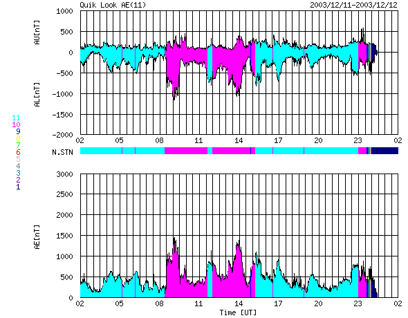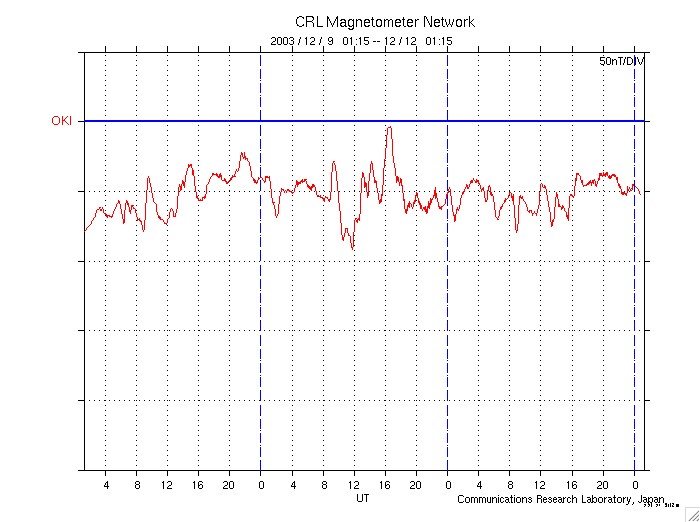 ACEが観測した太陽風の磁場(1番上の枠、白線は全体の強度、赤線は南北成分) および、太陽風の密度(3番目の橙線)、速度(4番目の黄線) (c) NOAA/SEC ![]() リアルタイムAE指数 下段のAEグラフの値が高くなると、オーロラ活動が活発化しています。 (c) 京都大学, CRL ![]() 沖縄の磁場擾乱 下へ下がるほど、擾乱が発達している事を意味します。 (c) CRL ![]() | |||||||||||||||||||||||||||||||||||||