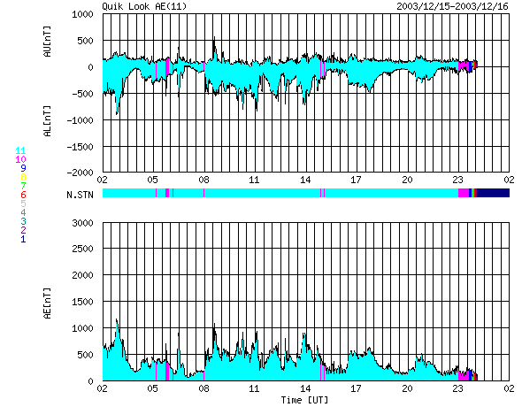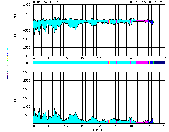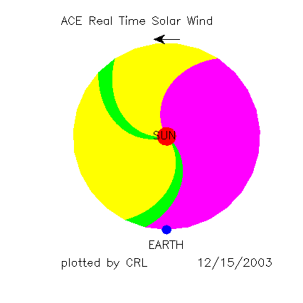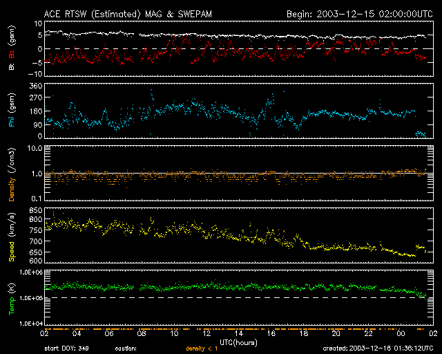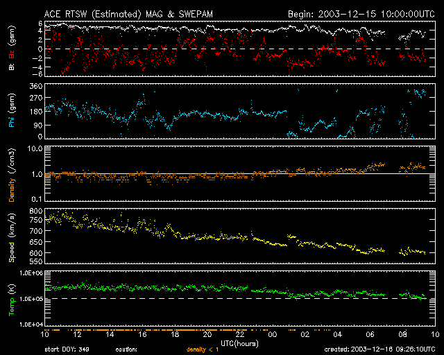 ACEが観測した太陽風の磁場(1番上の枠、白線は全体の強度、赤線は南北成分) および、太陽風の密度(3番目の橙線)、速度(4番目の黄線) (c) NOAA/SEC ![]() リアルタイムAE指数 下段のAEグラフの値が高くなると、オーロラ活動が活発化しています。 (c) 京都大学, CRL ![]() SOHO衛星のMDIカメラによる太陽黒点 (c) SOHO (ESA & NASA) ![]() 2003/12/16 18:28 追加 ACEが観測した太陽風の磁場(1番上の枠、白線は全体の強度、赤線は南北成分) および、太陽風の密度(3番目の橙線)、速度(4番目の黄線) (c) NOAA/SEC ![]() リアルタイムAE指数 下段のAEグラフの値が高くなると、オーロラ活動が活発化しています。 (c) 京都大学, CRL ![]() | ||||||||||||||||||||||||||||||||||