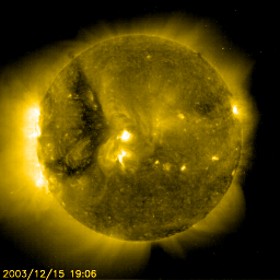 2003/12/16 10:38 更新 コロナホールの影響を抜けた様です。太陽風速度は通常レベルへ低下するでしょう。 2003/12/16 18:28 追加 太陽風の速度は600km/秒まで低下しています。 担当 篠原 太陽風は予想していたよりも長く、昨日一日非常に高速な状態を継続しました。 高速太陽風の発生源であるコロナホールはすっかり西縁(右端)へ移動していたのですが、 コロナホールの規模が大きかったので、影響の及ぶ範囲も広大だった様です。 ACE衛星のデータによると、15日20時(世界時15日11時)頃から太陽風の速度は低下を始め、 現在は650km/秒まで下がっています。 この後も、次第に低下すると思われます。 太陽風の磁場強度は5nT程度とあまり強くはありませんが、時々南を向いていました。 速度がたいへん高かったので、ある程度のオーロラ活動は見られた様です(AE指数の図を参照)。 今後、磁場の状況が大きく変化しなければ、 太陽風の速度が低下するに従って、活動度は更に下がると思われます。 今後の擾乱の見込みですが、 SOHO EIT284の太陽画像では、南北に長く延びたコロナホールが太陽の東側(左側)に見えています。 5〜6日程で地球に影響を及ぼし始めるでしょう。 南北に延びているので、影響を免れるということは無さそうです。 また、太陽風の大きな磁場構造の切り替わりの場所が近づいています。 セクター構造と呼ばれるものですが、一枚目の図をご覧ください。 紫の部分は太陽風の磁場が太陽から地球へ向かっている領域。黄色の部分は地球から太陽へ戻っている領域です。 この円盤は反時計回りに27日間で一回転しています。 現在、紫から黄色への切り替わりの領域に近づいています。 この切り替わりの時に、太陽風が乱れることが良くあります。 また、切り替わると別の領域に入る事になりますので、その後の磁場の状況にも注意が必要です。 最後に、久しぶりに太陽黒点の写真を見てみましょう。 中央に似た印象の2つの黒点群が見えています。活動的なものではない様です。 2003/12/16 18:28 追加 (篠原) 太陽風の速度は順調に低下し、600km/秒に下がっています。 太陽風磁場の強度も4nT程度へと弱まっています。 このため、AE指数によると、オーロラの活動もすっかり弱まった様子です。 しかし、太陽風の速度が500km/秒を下回るまでは、 太陽風磁場の変化によって擾乱が激しくなる可能性は十分あります。 太陽風のセクター構造 (c) CRL ![]() SOHO衛星のEIT284カメラの映像 (c) SOHO (ESA & NASA)