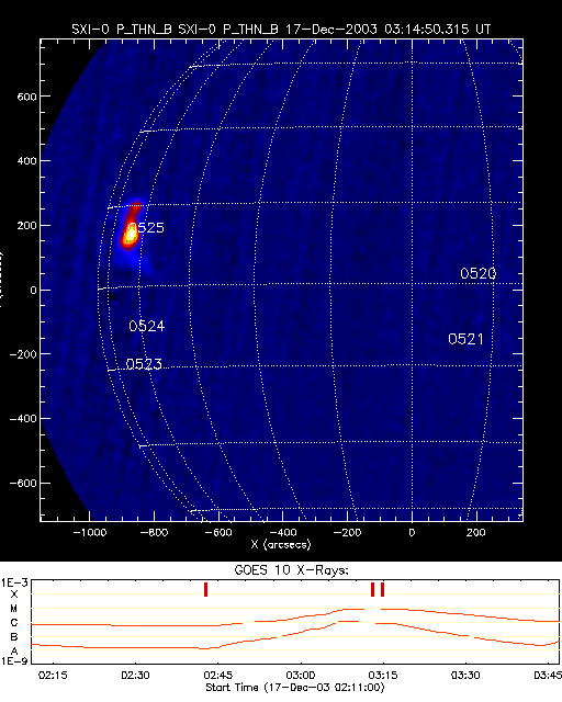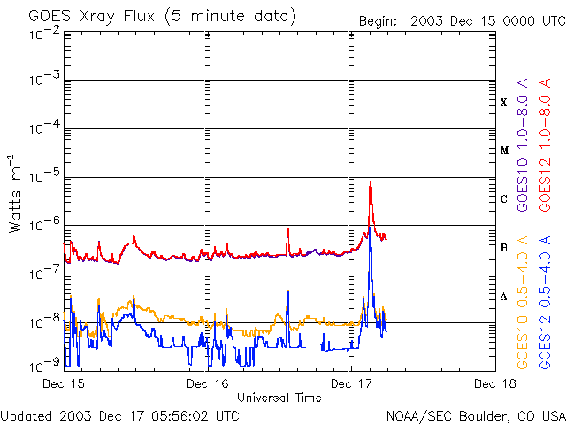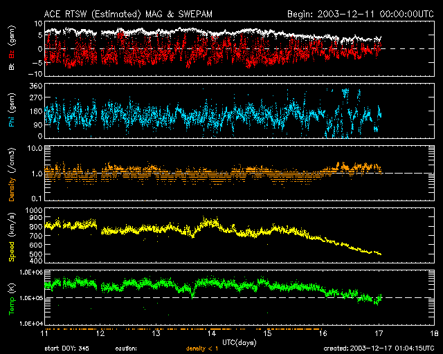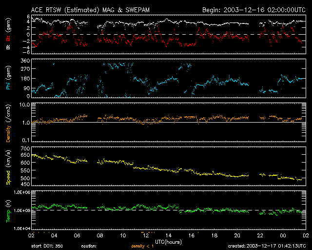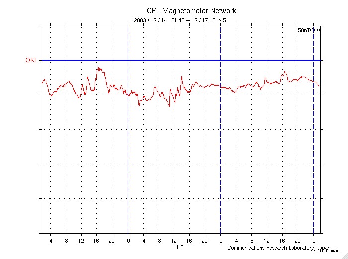 2003/12/17 10:44 更新 太陽風の速度は順調に低下しています。 2003/12/17 15:00 追加 C8.7クラスの中規模のフレア(太陽爆発)が発生しました。 担当 篠原 太陽風の速度は昨日から順調に低下を続けています。 現在は500km/秒まで下がりました。 磁場強度も4nTを切るほどまで弱まってきています。 速度の低下と合わせて、磁気圏が乱れる要素は減少しています。 今日は、図の1枚目に、1週間幅で作成されたACE衛星の太陽風データをお見せしています。 (2枚目はいつもの1日幅の図です) 掲載時刻の関係で実質6日分しか入っていませんが、800km/秒で何日も続いていた太陽風の速度(黄線)が、 2日前から急速に下がっている様子が良く分かります。 さて、沖縄の磁場変化を見ると、12月5日以来-50nTを前後する状態がずっと続いていましたが、 ようやく青線の静穏レベルへと戻ってきました。 2003/12/17 15:00 追加 (篠原) 17日12時(世界時17日3時)に、C8.7クラスの中規模のフレア(太陽爆発)が発生しました。 発生箇所は、まだ上って間もない太陽東縁(左端)の黒点群525番です。 東端ですので、磁気嵐など磁気擾乱への影響は無いと思われます。 ACEの太陽風データ。1週間分のプロット。 (c) NOAA/SEC ![]() ACEが観測した太陽風の磁場(1番上の枠、白線は全体の強度、赤線は南北成分) および、太陽風の密度(3番目の橙線)、速度(4番目の黄線) (c) NOAA/SEC ![]() 沖縄の磁場擾乱 下へ下がるほど、擾乱が発達している事を意味します。 (c) CRL ![]() 2003/12/17 15:00 追加 GOES衛星による太陽のX線画像 (c) NOAA/SEC ![]() GOES衛星の太陽X線データ (c) NOAA/SEC ![]() | |||||||||||||||||||||||||||||||||