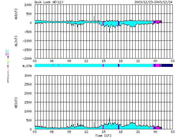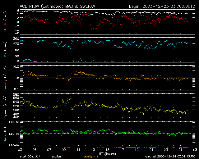ACEが観測した太陽風の磁場(1番上の枠、白線は全体の強度、赤線は南北成分) および、太陽風の密度(3番目の橙線)、速度(4番目の黄線) (c) NOAA/SEC ![]() リアルタイムAE指数 下段のAEグラフの値が高くなると、オーロラ活動が活発化しています。 (c) 京都大学, CRL ![]() GOES衛星の太陽X線データ (c) NOAA/SEC ![]() SOHO衛星のMDIカメラによる太陽黒点 (c) SOHO (ESA & NASA) ![]() | ||||||||||||||||||||||||||||||||||