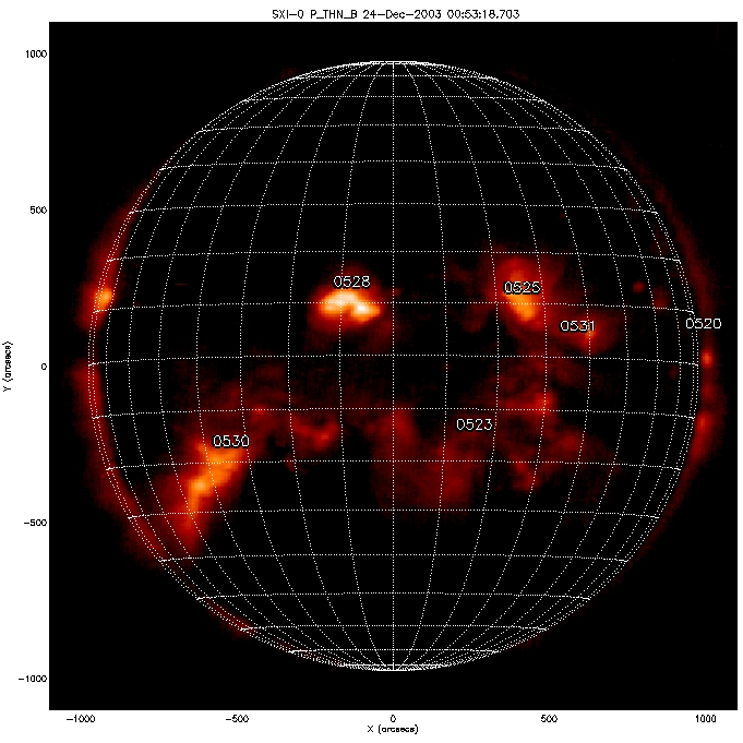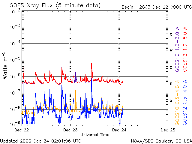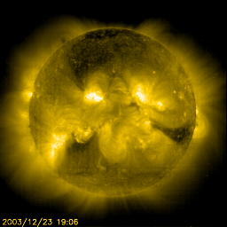 2003/12/24 11:01 更新 コロナホールの影響は弱まり、太陽風の速度は低下しつつあります。 担当 篠原 ACE衛星のデータによると、太陽風の速度(黄色線)は昨日より緩やかに低下を始め、500km/秒を切りました。 磁場の強さ(白線)は4nT程度とやや小さく、北よりの傾向が続いています(赤線)。 このため、オーロラ活動はAE指数によると、継続的ではありますが250nTの弱い活動が現れていた程度です。 SOHO EIT284の太陽画像によると、 コロナホール(太陽表面のやや暗い領域)はすっかり西縁(右端)に移動してしまいました。 まだ多少コロナホール領域が残っていますので、もう2日ほど太陽風がやや速い状態が続く可能性があります。 太陽ではCクラスの小規模なフレア(太陽爆発)が一昨日から頻発しています。 これは太陽黒点の525、528群が活発に活動しているためです。 今日、一枚目にお見せしている写真はGOES衛星による太陽のX線による画像です。 太陽黒点の写真(ニュースの一番下に表示しています)と比べてみて下さい。 525、528番のあたりが特に明るく見えています。 X線で太陽を見ると、普通の光で見る太陽とはずいぶん様子が異なって見えます。 GOES衛星による太陽のX線画像 (c) NOAA/SEC ![]() SOHO衛星のEIT284カメラの映像 (c) SOHO (ESA & NASA)