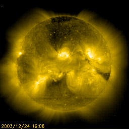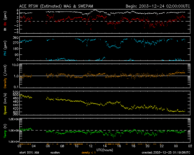2003/12/25 10:20 更新 太陽風の速度は400km/秒まで低下しました。しばらく大きな乱れは起こらないでしょう。 担当 篠原 昨日も太陽風の速度(ACE衛星の黄色線)は順調に低下し、既に400km/秒と静かな状態に戻っています。 太陽風磁場の強さ(白線)も4nT程度と比較的弱い値になっていますので、磁気圏内が大きく乱れる要因はありません。 しかし、オーロラ活動は時々発生しており、AE指数のデータによると、 25日2時(24日17時)にオーロラ活動が一時活発化していた様です。 SOHO衛星EIT 284の太陽画像によると、 太陽面の東側(向かって左側)にコロナホールの領域(太陽表面の暗くなっている領域)は見られません。 これから年末にかけて、しばらくは穏やかな日が続きそうです。 SOHO衛星のEIT284カメラの映像 (c) SOHO (ESA & NASA)
