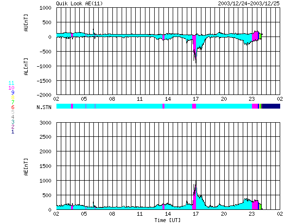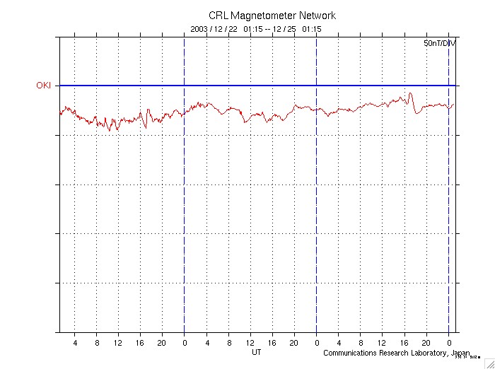 ACEが観測した太陽風の磁場(1番上の枠、白線は全体の強度、赤線は南北成分) および、太陽風の密度(3番目の橙線)、速度(4番目の黄線) (c) NOAA/SEC ![]() リアルタイムAE指数 下段のAEグラフの値が高くなると、オーロラ活動が活発化しています。 (c) 京都大学, CRL ![]() 沖縄の磁場擾乱 下へ下がるほど、擾乱が発達している事を意味します。 (c) CRL ![]() | ||||||||||||||||||||||||||||||||||