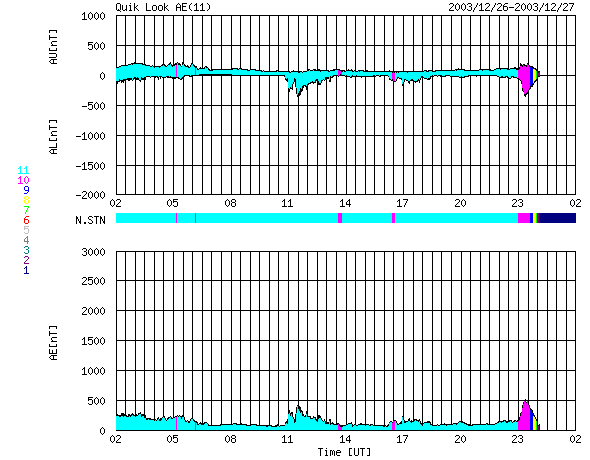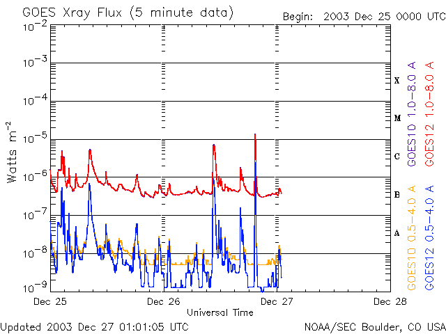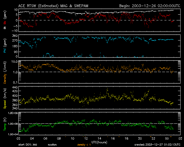 2003/12/27 10:01 更新 磁気圏は静かな状態が続いています。 担当 篠原 27日4時(26日19時)にM1.5クラスの中規模のフレア(太陽爆発)が発生しています。 GOES衛星のX線観測に鋭いピークが見えています。 図の右端にX,M,C,B,Aと書いてありますが、これはフレアの規模の分類を示しています。 黒点群528番で発生したようです。 太陽風の速度は360〜400km/秒台を保っており、静穏な状態が続いています。 オーロラ活動を示すAE指数も目立った変化は見られません。 ただし、太陽風の磁場強度が10nT近くまで強まっているため、 南向き成分が強まると、オーロラの活動がやや活発化する可能性があります。 (太陽風の速度が遅いため、激しいものにはならないでしょう) GOES衛星の太陽X線データ (c) NOAA/SEC ![]() SOHO衛星のMDIカメラによる太陽黒点 (c) SOHO (ESA & NASA) ![]() ACEが観測した太陽風の磁場(1番上の枠、白線は全体の強度、赤線は南北成分) および、太陽風の密度(3番目の橙線)、速度(4番目の黄線) (c) NOAA/SEC ![]() リアルタイムAE指数 下段のAEグラフの値が高くなると、オーロラ活動が活発化しています。 (c) 京都大学, CRL ![]() | |||||||||||||||||||||||||||||||||