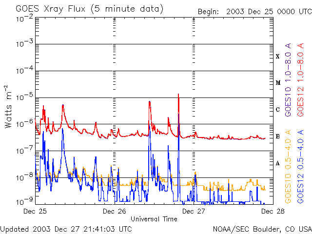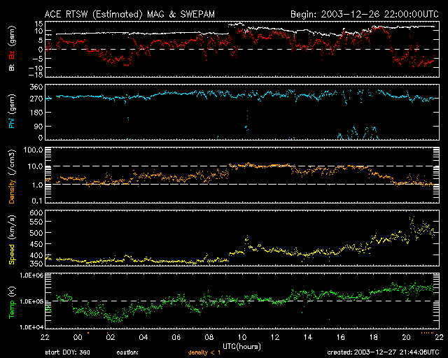 2003/12/28 06:44 更新 磁気圏は静かです。これから、短期的にオーロラが活発になるかもしれません。 担当 篠原 昨日は、太陽風は低速な状態が続き(黄色線。400km/秒前後)、磁気圏では擾乱はほとんど見られませんでした。 しかし、昨日の後半から徐々に太陽風の速度に上昇が見られ、現在は500km/秒とやや高速な状態に達しています。 また、太陽風の磁場強度(白線)は10nT程度と大きい値を持っており、注意が必要な状態が続いていましたが、 28日4時(世界時27日19時)から南向き成分(赤線)を大きく持つ様になっています。 太陽風速度の増加と、南向き磁場の増加が重なったため、これからオーロラ活動が活発になる事が予想されます。 しかし、SOHO EIT284カメラの太陽画像を見ると、 今回の太陽風速度上昇の原因となるようなコロナホール(やや暗くなっている領域)は 太陽の西側(右側半分)にはほとんど見られません。 従って、今回の太陽風の速度上昇は長い時間続かないのではないかと思われます。 今後しばらくは、南向き磁場の状況に注意してください。 太陽フレアは昨日のMクラス発生後は静かになっています。 SOHO衛星のEIT284カメラの映像 (c) SOHO (ESA & NASA)