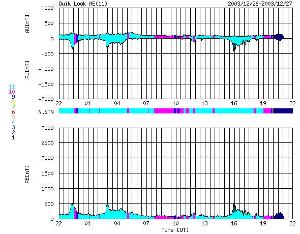 ACEが観測した太陽風の磁場(1番上の枠、白線は全体の強度、赤線は南北成分) および、太陽風の密度(3番目の橙線)、速度(4番目の黄線) (c) NOAA/SEC ![]() リアルタイムAE指数 下段のAEグラフの値が高くなると、オーロラ活動が活発化しています。 (c) 京都大学, CRL ![]() GOES衛星の太陽X線データ (c) NOAA/SEC ![]() | ||||||||||||||||||||||||||||||||||