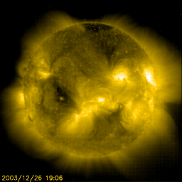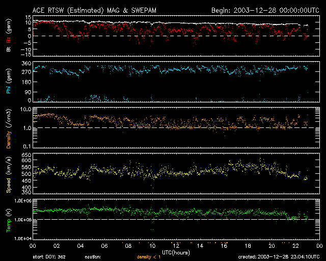2003/12/29 08:05 更新 太陽風の速度がやや速い状態が続いていましたが、低下し始めています。 担当 篠原 太陽風は昨日一日やや速い(500〜550km/秒)状態が続きました(ACEデータの黄色線)。 SOHO EIT284の太陽画像では対応するコロナホールは見られず、発生源は良く分かりません。 高速風は次第に低下を始めたようで、現在450km/秒に下がっています。 AE指数を見ると、太陽風が高速となった影響で時々活発なオーロラ活動が見られた様です。 ただし、太陽風磁場は北向きが中心だった(ACEデータの赤線)ため、激しい変動にはなりませんでした。 現在も太陽風磁場(白線)は8nT程度とやや強い状態ですので、南向きが卓越する(赤線がマイナス方向に振れる)と、 オーロラ活動が活発になるでしょう。 しかし、太陽風の速度低下とともに磁場強度も下がっていますので、 今後は擾乱の発生要素は減って行くと思われます。 太陽黒点は、大きな528群が中央線を越え、西端(右端)へ向かっています。 その後には目立った黒点は見られません。 SOHO衛星のEIT284カメラの映像 (c) SOHO (ESA & NASA)