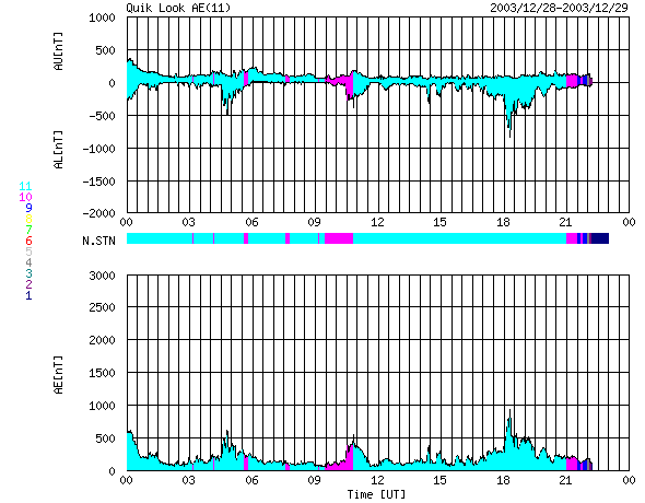 ACEが観測した太陽風の磁場(1番上の枠、白線は全体の強度、赤線は南北成分) および、太陽風の密度(3番目の橙線)、速度(4番目の黄線) (c) NOAA/SEC ![]() リアルタイムAE指数 下段のAEグラフの値が高くなると、オーロラ活動が活発化しています。 (c) 京都大学, CRL ![]() SOHO衛星のMDIカメラによる太陽黒点 (c) SOHO (ESA & NASA) ![]() | ||||||||||||||||||||||||||||||||||