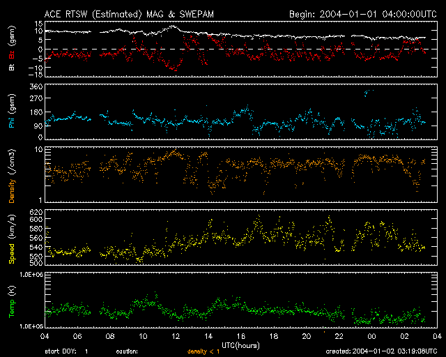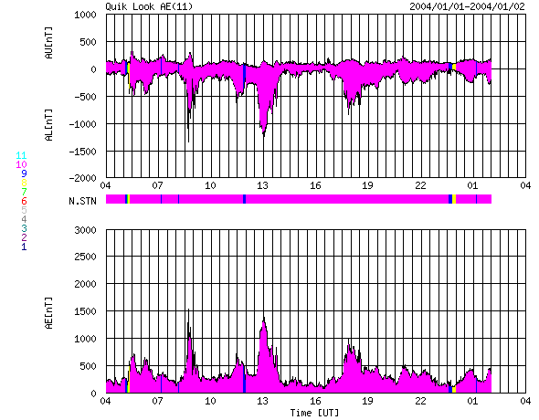 ACEが観測した太陽風の磁場(1番上の枠、白線は全体の強度、赤線は南北成分) および、太陽風の密度(3番目の橙線)、速度(4番目の黄線) (c) NOAA/SEC ![]() リアルタイムAE指数 下段のAEグラフの値が高くなると、オーロラ活動が活発化しています。 (c) 京都大学, CRL ![]() | ||||||||||||||||||||||||||||||||||||