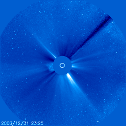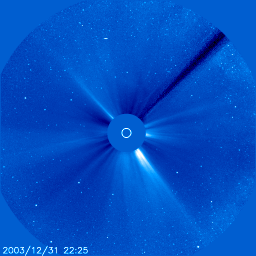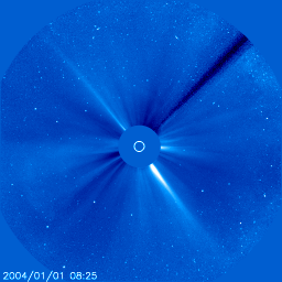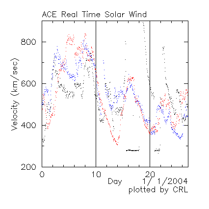 2004/ 1/ 2 12:19 更新 太陽風が高速です。オーロラ活動も活発です。あと1日程度で一旦静まると予想されます。 担当 篠原 昨日お伝えした、1日7時(世界時31日22時)のC8クラスのフレア(太陽爆発)による CME(太陽プラズマの放出現象)が、SOHO衛星で観測されていましたので紹介します。 LASCO C3カメラ写真2枚目の、太陽の左側に小さく、飛び出しはじめのCMEが写っています。 残念ながら途中の撮影が無かったため、3枚目ではすっかり広がってしまっていますが、 画面の左端の手前くらいにCMEの先頭が延びているのが分かります。 ACE衛星の観測によると、現在も太陽風の速度(黄色線)は550km/秒と高いレベルを保っています。 昨日の磁場強度(白線)は5〜10nT程度を保ち、南向き(赤線がー側へ振れる)の時間帯が多かったため、 激しいオーロラ活動が時々発生していた様です。 オーロラの活動度を示すAE指数を見ると、1日18時、22時、2日3時(世界時1日9時、13時、18時)に 1000nTに達する激しい変化が見られます。 それ以外の時間でも、250〜500nTの変化を示しており、一日中オーロラ活動が活発だった様です。 太陽風磁場の強度は昨日より緩やかに減少の傾向を示していますので、 擾乱の起こり方は次第に弱まって行くと思われます。 SOHO衛星の観測が無いため、コロナホールの状況が分かりません。 太陽風は太陽の自転によって、27日周期で同じ変化を示す傾向があります。 27日前の太陽風の様子を振り返って、これからの変化を考えてみます。 下に「太陽風速度の27日間の変化」という図を示しています。 赤線に注目してください。これは過去27日間の太陽風速度の変化を示しています。 言い換えると、これから27日間の太陽風速度の予想とも言えます。 左端が現在です。27日前も今日と同じ550km/秒程度の高速な状態だった事が分かります。 この図によると高速太陽風はあと1日程度で下がり、静穏レベルに戻ります。 しかし、2日後から再び上昇し、4日後には800km/秒と大変高速な状態に達します。 こちらの高速太陽風は8日間も続いています。 これだけ長期に続くのは、太陽面に大規模なコロナホールが発生していたためです。 来週は警戒が必要でしょう。 ミクロネシア、ヤップ島の磁力計。NOAAの気象台に間借りして設置しています。赤道の磁気変化は宇宙天気研究にたいへん重要です。 (c) CRL ![]() 太陽風速度の27日間の変化 (c) CRL ![]() SOHO衛星のLASCO C3カメラの映像 (c) SOHO (ESA & NASA)