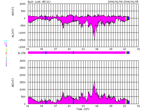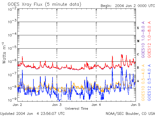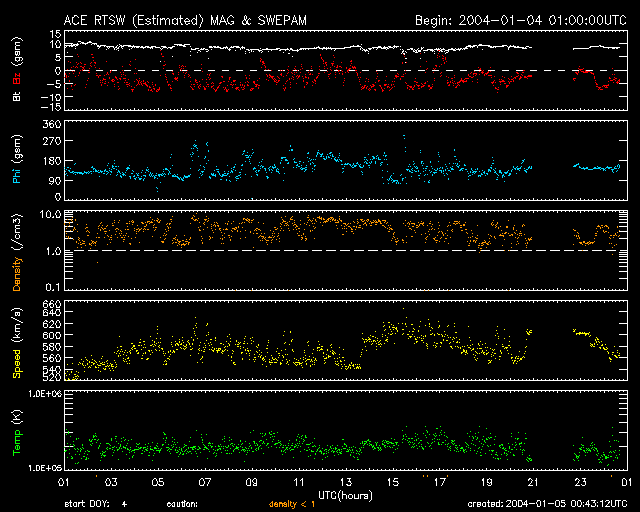 2004/ 1/ 5 09:43 更新 太陽風はやや高速で、オーロラを活発にしています。これから太陽風は更に速度が上昇すると思われます。 担当 篠原 ACE衛星の観測によると、太陽風は速度550〜600km/秒を維持し(黄色線)、 やや高速な状態を保っています。 SOHO衛星EITカメラの観測が無い(明日か明後日から再開する様です)ため、 コロナホールの様子が分かりませんが、 このまま大規模なコロナホールが作っている高速太陽風領域へ入る事になりそうです。 過去の経過から、これから8日間程度高速状態が継続する可能性があります。 太陽風磁場は強度10nTレベルが続いており(白線)、 南向き成分は昨日一日を通して、-5nTの強さが続いていました(赤線)。 このためオーロラ活動も活発だった様で、 AE指数のグラフによると500nT前後の活動が長時間見られています。 これから太陽風の速度が上昇すると、磁気圏内の擾乱が更に活発になる可能性があります。 (太陽風磁場の状況も大きく変化すると予想されますので、その変化との兼ね合いになります) 太陽では、Cクラスの小規模なフレアが頻発しています。 これは太陽の東端(左端)からやや中央寄りに見られる536黒点群が活発に起こしているものです。 この黒点群はこれから太陽の中央へ移動して来ますので、地球への影響はより大きくなります。 今後の活動に注意が必要です。 ACEが観測した太陽風の磁場(1番上の枠、白線は全体の強度、赤線は南北成分) および、太陽風の密度(3番目の橙線)、速度(4番目の黄線) (c) NOAA/SEC ![]() リアルタイムAE指数 下段のAEグラフの値が高くなると、オーロラ活動が活発化しています。 (c) 京都大学, CRL ![]() GOES衛星の太陽X線データ (c) NOAA/SEC ![]() | |||||||||||||||||||||||||||||||||