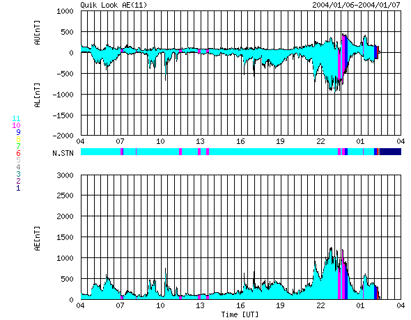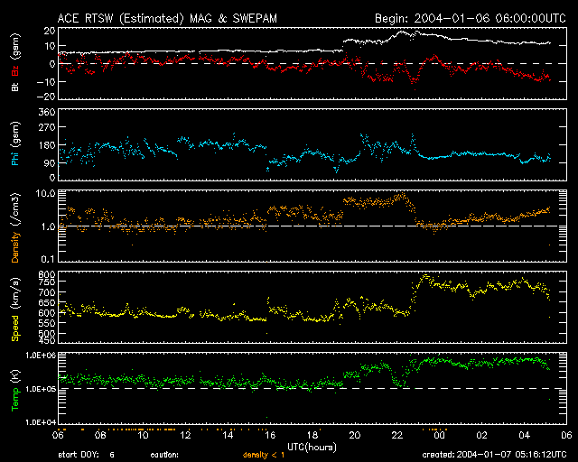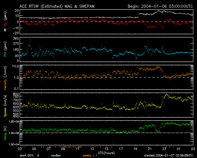 2004/ 1/ 7 12:00 更新 太陽風の速度が急に700km/秒台へ上昇しています。 2004/ 1/ 7 14:17 追加 太陽風磁場が大きく南を向きました(-10nT)。磁気圏の擾乱が活発になると予想されます。 担当 篠原 7日4時半(世界時6日19時半)頃から、太陽風の様子が大きく変わっています。 磁場強度(白線)が急に強まり(7nT->13nTへ)、密度(橙線)も上昇しています。 その後、7日7時半(世界時6日22時半)に速度(黄色線)が上昇を始め、約1時間かけて800km/秒弱まで上昇しました。 密度は速度と相反する様に減少に転じています。 太陽風の変化の過程で、太陽風磁場が大きく南を向く時間帯が見られました。 このため、7日6時(世界時6日21時)から7日9時(世界時7日0時)にかけて、 オーロラ活動がかなり活発になっていた様です(AE指数の図を参照)。 この変動の原因として、5日12時(世界時5日3時)のMクラスのフレア(太陽爆発)に続いて発生した、 CME(太陽プラズマの放出現象)が考えられます。 太陽風の速度は現在も700km/秒以上のたいへん高速な状態を維持しています。 磁場の南向きが小さくなっているため、磁気圏内はやや落ち着いていますが、 磁場強度としては10nTレベルを保っていますので、 磁場の向きの変化によっては擾乱が活発になる可能性があります。 久しぶりに太陽黒点の画像が更新されていましたので、掲載します。 このところ活発にフレアを発生させている536黒点群が太陽の中心付近に見えています。 2004/ 1/ 7 14:17 追加 (篠原) 7日12時(世界時7日3時)以降、太陽風磁場の向きが大きく南寄りに変化し、一時-10nTに達しています。 太陽風の速度が700km/秒とたいへん高速ですので、オーロラ活動などがかなり活発になると予想されます。 太陽風は密度の上昇も示しており、磁場の方向を含めてこれからも大きく変化すると思われます。 高速風が続いている間は注意が必要です。 ACEが観測した太陽風の磁場(1番上の枠、白線は全体の強度、赤線は南北成分) および、太陽風の密度(3番目の橙線)、速度(4番目の黄線) (c) NOAA/SEC ![]() リアルタイムAE指数 下段のAEグラフの値が高くなると、オーロラ活動が活発化しています。 (c) 京都大学, CRL ![]() SOHO衛星のMDIカメラによる太陽黒点 (c) SOHO (ESA & NASA) ![]() 2004/ 1/ 7 14:17 追加 ACEが観測した太陽風の磁場(1番上の枠、白線は全体の強度、赤線は南北成分) および、太陽風の密度(3番目の橙線)、速度(4番目の黄線) (c) NOAA/SEC ![]() | |||||||||||||||||||||||||||||||||