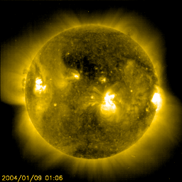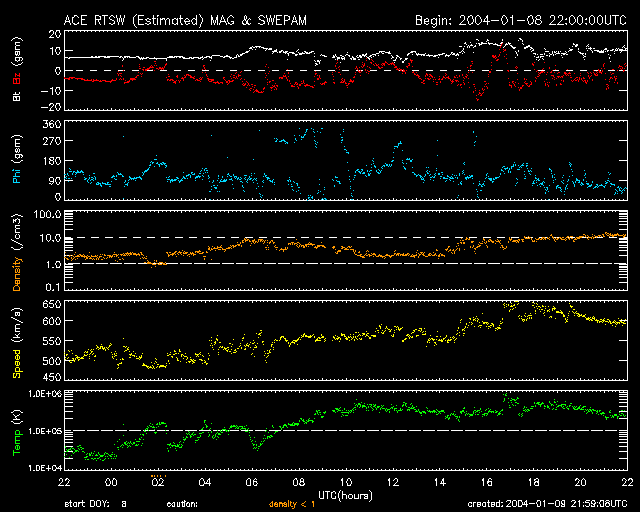 2004/ 1/10 07:00 更新 太陽風の南向き磁場の強まりによってオーロラ活動が活発になっています。 担当 篠原 ACE衛星の観測によると、太陽風の速度(黄色線)は再び緩やかに上昇を始め、一時650km/秒に達しています。 また、磁場強度(白線)が10nT程度まで強まり、大きく南を向く(赤線がマイナス側へ)事が多くなっています。 このため、磁気圏ではオーロラ活動がかなり活発になっていました。 AE指数のグラフを見ると、500〜1000nTの活動を長時間に渡って継続しています。 太陽風速度は600km/秒を保っており、磁場強度も強い状態が続いています。 まだしばらくは擾乱が活発な状態が続くでしょう。 しかし、この高速風の発生源と思われるコロナホールの規模は、 あまり大きなものではありませんので(SOHO EITカメラ参照)、 もう一日程度で収まるのではないかと思われます。 SOHO衛星のEIT284カメラの映像 (c) SOHO (ESA & NASA)
