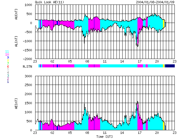 ACEが観測した太陽風の磁場(1番上の枠、白線は全体の強度、赤線は南北成分) および、太陽風の密度(3番目の橙線)、速度(4番目の黄線) (c) NOAA/SEC ![]() リアルタイムAE指数 下段のAEグラフの値が高くなると、オーロラ活動が活発化しています。 (c) 京都大学, CRL ![]() | |||||||||||||||||||||||||||||||||||
