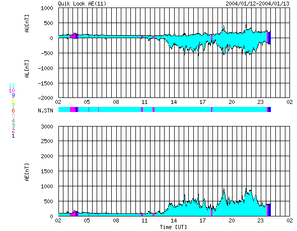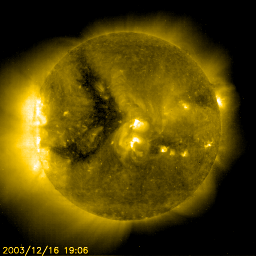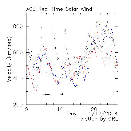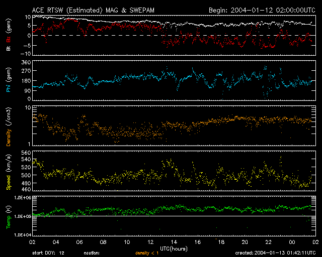 2004/ 1/13 10:41 更新 太陽風磁場が南向き傾向のため、オーロラ活動が活発になっています。 担当 篠原 太陽風の速度(ACE衛星の黄色線)は徐々に低下し、450km/秒まで下がっています。 このまま静穏レベル(400km/秒程度)へ落ち着くと思われます。 一方、12日22時(世界時12日13時)頃から太陽風磁場の傾向が変わり、 南向き成分を大きく(-5nT程度)持つ様になりました(ACE衛星の赤線)。 この様子は現在も続いており、赤線はマイナス方向を取りながら大きく変化しています。 このため、オーロラ活動が活発になっています。 オーロラの活動度を示すAE指数を見ると、 12日22時(世界時12日13時)以降、500nT前後の変化が続いています。 高速太陽風が一段落付きましたので、今後の展望を考えることにします。 今日の図の1枚目に、SOHO EITカメラによる最新の太陽画像を掲載します。 太陽面中心からやや東寄り(左寄り)に南北(縦方向)に延びるコロナホール(暗くなっている領域)が見えています。 太陽は自転していますので、約27日周期で同じ面を地球へ向けることになります。 その1周期前にあたる、12月17日の太陽画像を2枚目に示します。 大変似た位置に似た形のコロナホールが広がっている事が分かります。 従って、これから10日間程度の太陽風の変化は、27日前を振り返る事で予想できそうです。 3枚目に過去の太陽風の速度変化を描いた図を示しています。 赤線が、27日前の太陽風速度の変化を示しています。 横軸は1目盛り2日刻みで、左から右へ向かって変化すると考えて下さい。 これを見ると、太陽風速度は3日後に300km/秒にまで下がります。 その後コロナホールの影響領域に入り、速度が上昇。600km/秒に達します。 高速風は3日ほど続きそうです。 コロナホールの位置や広がりは変化していますので、常に27日前と同じ変化をする訳ではありません。 ですが、今回は写真に見えるコロナホールの分布が大変似ていますので、 かなり似た速度変化を示すのではないでしょうか。 2004年1月13日の太陽画像(SOHO衛星EIT284カメラ) (c) ESA & NASA ![]() 上の27日前、2003年12月17日の太陽画像(SOHO衛星EIT284カメラ) (c) ESA & NASA ![]() 太陽風速度の27日間の変化 (c) CRL ![]() ACEが観測した太陽風の磁場(1番上の枠、白線は全体の強度、赤線は南北成分) および、太陽風の密度(3番目の橙線)、速度(4番目の黄線) (c) NOAA/SEC ![]() リアルタイムAE指数 下段のAEグラフの値が高くなると、オーロラ活動が活発化しています。 (c) 京都大学, CRL ![]() | ||||||||||||||||||||||||||||||||||