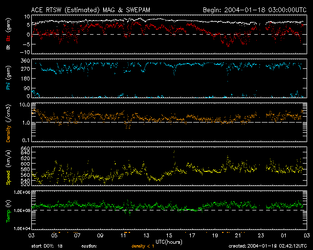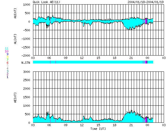 ACEが観測した太陽風の磁場(1番上の枠、白線は全体の強度、赤線は南北成分) および、太陽風の密度(3番目の橙線)、速度(4番目の黄線) (c) NOAA/SEC ![]() リアルタイムAE指数 下段のAEグラフの値が高くなると、オーロラ活動が活発化しています。 (c) 京都大学, CRL ![]() | |||||||||||||||||||||||||||||||||||