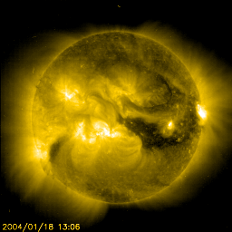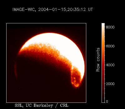 2004/ 1/19 11:43 更新 550km/秒の高速太陽風が継続しています。 担当 篠原 今日1枚目の図にIMAGE衛星が観測したオーロラ画像を掲載します。 1月16日(世界時1月15日)に観測されたオーロラです。 写真は、地球を横に見る構図になっています。 左が北極、右が南極、上が昼側で太陽の光が当たっています。 右の南極地域に丸いドーナツ状にオーロラが光って見えています。 反対の北極側(左)にも微かにオーロラの光が見えています。 衛星観測ならではの南極と北極のオーロラ同時撮影です。 ACE衛星の観測によると、太陽風は550km/秒前後の高速状態が続いています(黄色線)。 全磁場強度(白線)は5nTを超える程度の強さを保っています。 そのため、南向き成分(赤線)が卓越した場合に、オーロラ活動が活発になっています。 例えば、19日4-7時(世界時18日19-22時)に太陽風磁場が南向きになっている時間帯がありますが、 これに対応する様に、19日5-8時(世界時18日20-23時)に AE指数が500nTに達するオーロラ活動が見られています。 SOHO EIT284カメラの太陽画像では、 コロナホール(暗く見えている領域)が太陽の中心付近を通過しきった様です。 このことから、あと4日程度太陽風が高速な状態が続くと思われます。 IMAGE衛星が観測したオーロラ。右に南極の、左に北極のオーロラが見えている。 (c) SSL, UC Berkeley / CRL ![]() SOHO衛星のEIT284カメラの映像 (c) SOHO (ESA & NASA)