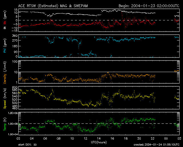 沖縄の磁場擾乱 下へ下がるほど、擾乱が発達している事を意味します。 (c) CRL ![]() ACEが観測した太陽風の磁場(1番上の枠、白線は全体の強度、赤線は南北成分) および、太陽風の密度(3番目の橙線)、速度(4番目の黄線) (c) NOAA/SEC ![]() | |||||||||||||||||||||||||||||||||||||||