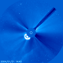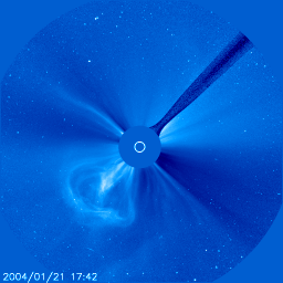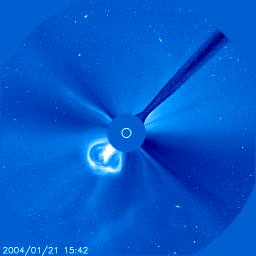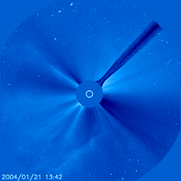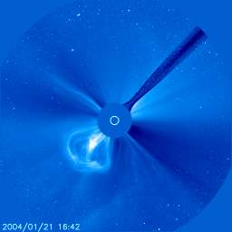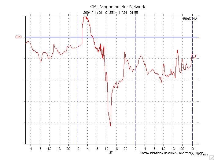 2004/ 1/24 10:57 更新 磁気嵐は弱まっています。太陽風は500km/秒に低下し、磁場強度も5nTに下がりました。 担当 篠原 沖縄磁場変動を見ると、最大-200nTに達していた静穏レベル(青線)からのずれは、 現在は-50nTにまで戻っています(この線が下がる程、磁気嵐が発達しています)。 磁気嵐は次第に弱まって来ている様です。 太陽風の速度(ACEデータの黄色線)は500km/秒程度にまで下がりました。 23日23時(世界時23日14時)に速度がやや上昇し、磁場強度(白線)が急に強くなっていますが、 これが21日に観測されたFull Halo CMEの影響かもしれません。 そうであれば、これから太陽風は更に速度を下げ、静穏な状態(400km/秒程度)に戻るでしょう。 (衝撃波とは別のものであった場合は、今日、改めて速度の上昇が現れるかもしれません) 太陽風の磁場強度(白線)は次第に下がり、南向き成分(赤線)も弱まっています。 速度の低下と相まって、磁気擾乱を起こす要因は減少しています。 今回の磁気嵐とは関係ありませんが、SOHO衛星のLASCO C3カメラで 大変美しいCME(太陽ガスの放出現象)が観測されていましたので紹介します。 各写真の中央に見える白い丸は太陽の光っている部分の大きさを示しています。 この丸と比較すると、太陽ガスの放出現象の規模の巨大さが良く分かります。 これだけの巨大な噴出が、わずか4時間で起きているのです。 SOHO衛星のLASCO C3カメラの映像 (c) SOHO (ESA & NASA)