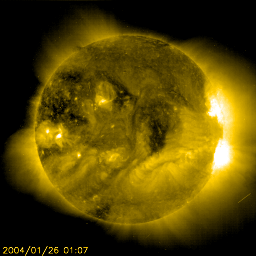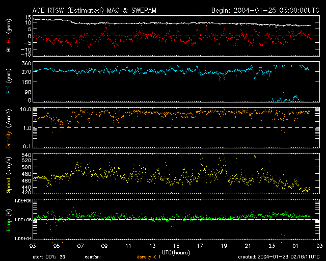 2004/ 1/26 11:17 更新 太陽風の速度は静穏レベルにもどりましたが、磁場が激しく変化しておりオーロラは活発です。 担当 篠原 昨日のニュース発行後、太陽風の磁場が-10nTと大きく南を向き、オーロラ活動が活発になりました。 その後も太陽風磁場の南北成分が5nT程度の強さで南北に振動する様な変化を見せています。 このため、オーロラ活動も活発な状態が長時間続き、 オーロラの指標であるAE指数を見ると、500nT超の変化がほぼ一日に渡って現れています。 太陽風の磁場強度は弱まる傾向にありますので、この擾乱も次第に収束すると思われますが、 南北成分の振動傾向は続いていますので、磁場強度が強い間はもうしばらくこの乱れが続くでしょう。 太陽の表面では目立った黒点はほとんど見られず、のっぺらな状態です。 SOHO衛星EIT284画像では中央部に小さなコロナホールが見られます。 明後日頃に、この影響で太陽風の速度が一時的に上がりそうです。 また、東側(左側)に、まだ見づらいですが大きなコロナホールの広がりが見えています。 一週間後頃から、このコロナホールの影響が地球へ及び始めるでしょう。 今後のSOHO EIT284の観測でコロナホールの分布が詳しく分かるはずです。 今日・明日頃に太陽風磁場のセクター構造の切り替わりが発生しそうです。 それに伴って太陽風の状況が変わる事がありますので注意が必要です。 SOHO衛星のEIT284カメラの映像 (c) SOHO (ESA & NASA)