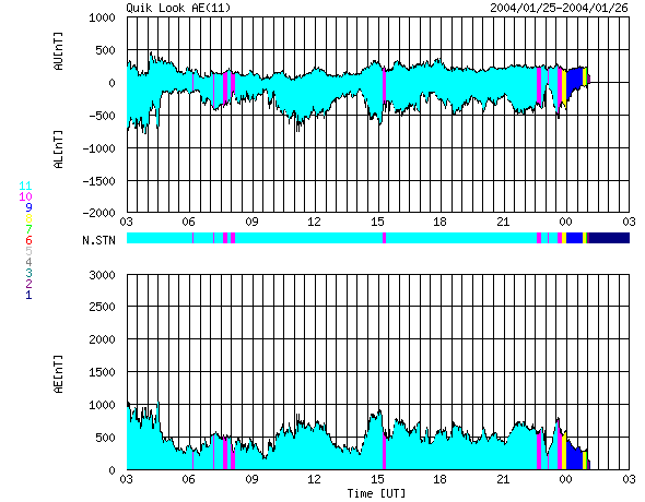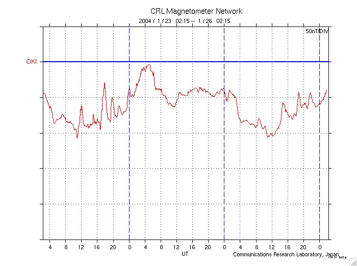 ACEが観測した太陽風の磁場(1番上の枠、白線は全体の強度、赤線は南北成分) および、太陽風の密度(3番目の橙線)、速度(4番目の黄線) (c) NOAA/SEC ![]() リアルタイムAE指数 下段のAEグラフの値が高くなると、オーロラ活動が活発化しています。 (c) 京都大学, CRL ![]() 沖縄の磁場擾乱 下へ下がるほど、擾乱が発達している事を意味します。 (c) CRL ![]() SOHO衛星のMDIカメラによる太陽黒点 (c) SOHO (ESA & NASA) ![]() | |||||||||||||||||||||||||||||||||||