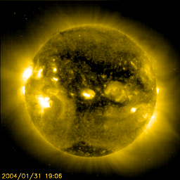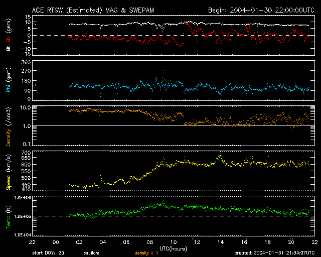 2004/ 2/ 1 06:35 更新 大規模なコロナホールによる高速太陽風領域に入りました。 担当 篠原 ACE衛星のデータによると、太陽風の速度(黄色線)は昨日一旦450km/秒に下がった後、 31日16時(世界時31日7時)頃から再び上昇を始め、600km/秒に達しています。 いよいよコロナホールによる高速太陽風領域に突入した様です。 太陽風から地球磁気圏へのエネルギーの流入量を決める太陽風磁場の南向き成分(赤線のマイナス方向)は、 今の所、-5nT以内の小さな値が時々現れる程度です。 このため、磁気圏は静穏な状態が続いています。 オーロラ活動を示すAE指数は、31日20時(世界時31日11時)の時間帯以外はほとんど変化が見られません。 沖縄の磁場変動のグラフも、青の横線で示している静穏レベルに留まっています。 磁気嵐が始まると静穏レベルから大きくマイナス方向に変化していきます。 ACE衛星のデータでは、太陽風磁場は7nT程度の強度を持っていますので(白線)、 急に大きな南向き磁場を持つ可能性があります。 その場合は磁気圏は急に乱れ始めますので、太陽風磁場の変化に注意が必要です。 SOHO 284カメラの太陽画像に見えるコロナホール(暗く見えている領域)の広さから考えて、 高速太陽風はこれから1週間程度続くと予想されます。 SOHO衛星のEIT284カメラの映像 (c) SOHO (ESA & NASA)