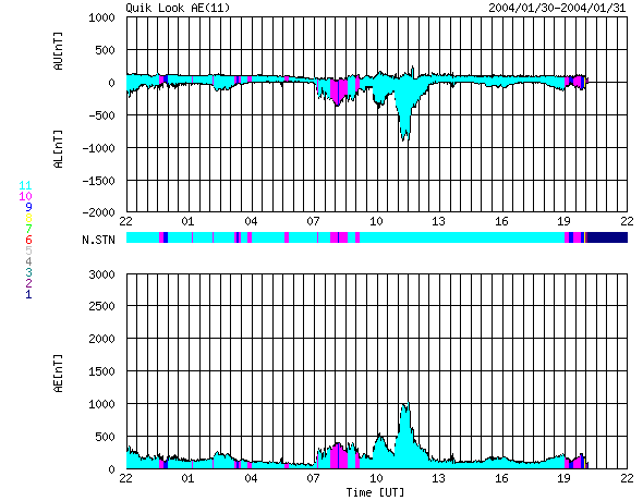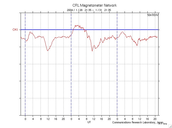 ACEが観測した太陽風の磁場(1番上の枠、白線は全体の強度、赤線は南北成分) および、太陽風の密度(3番目の橙線)、速度(4番目の黄線) (c) NOAA/SEC ![]() リアルタイムAE指数 下段のAEグラフの値が高くなると、オーロラ活動が活発化しています。 (c) 京都大学, CRL ![]() 沖縄の磁場擾乱 下へ下がるほど、擾乱が発達している事を意味します。 (c) CRL ![]() | |||||||||||||||||||||||||||||||||||